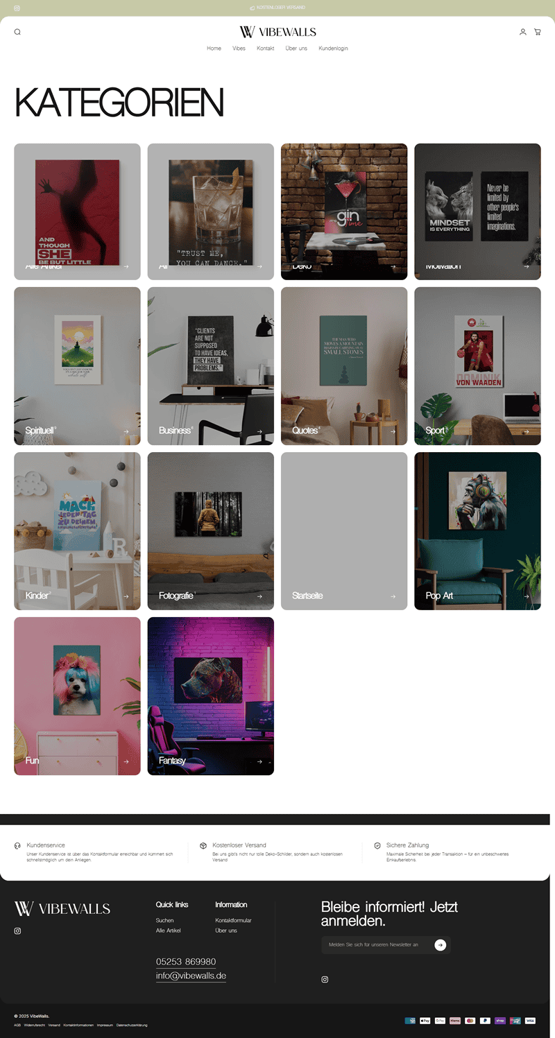 Vibewalls.de ist ein neu eröffneter Onlineshop für hochwertige und individuell gestaltbare Wandbilder. Der Shop verfolgt das Ziel, Kunden inspirierende Kunstwerke anzubieten, die ihre Wohnräume aufwerten und einzigartig machen. Für die Realisierung der neuen Plattform wurde Shopify als Shopsystem ausgewählt.