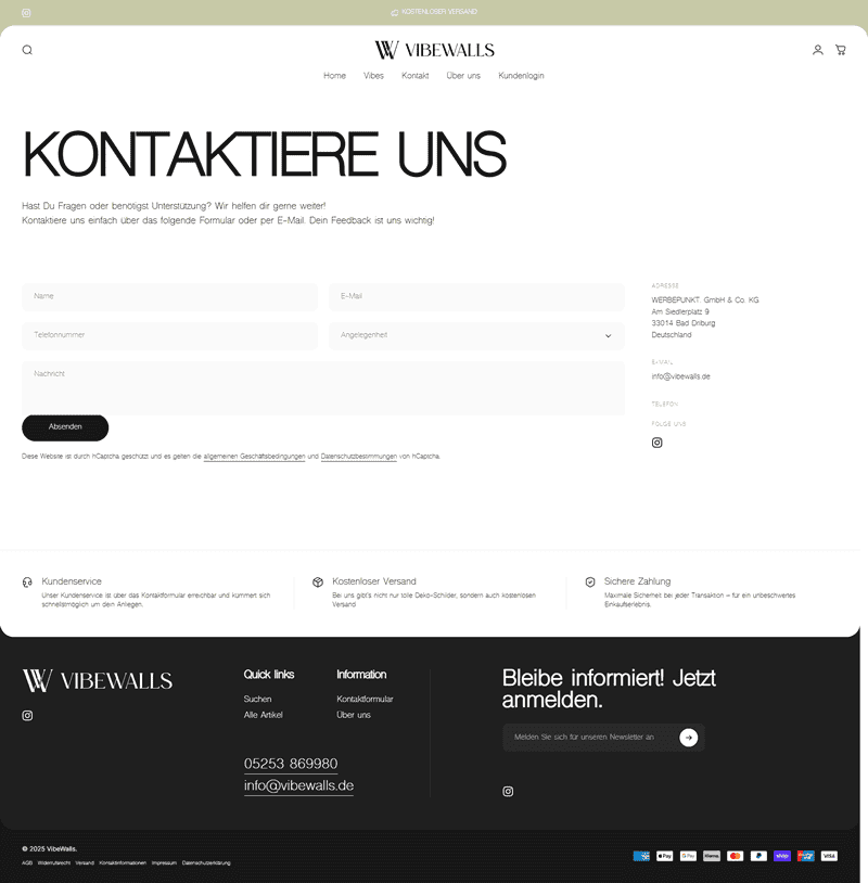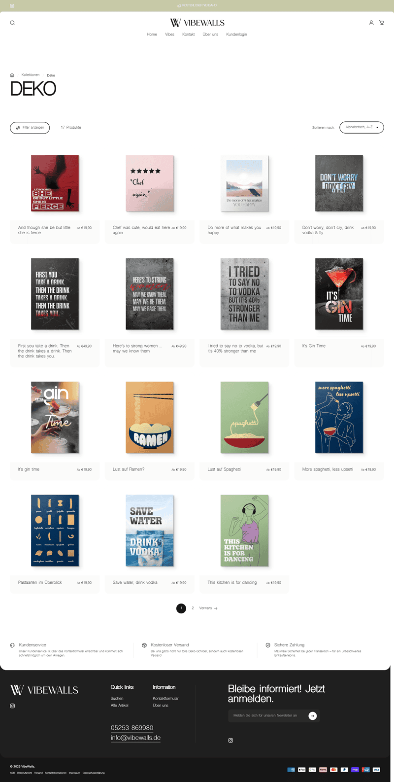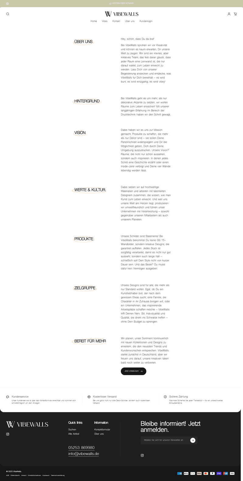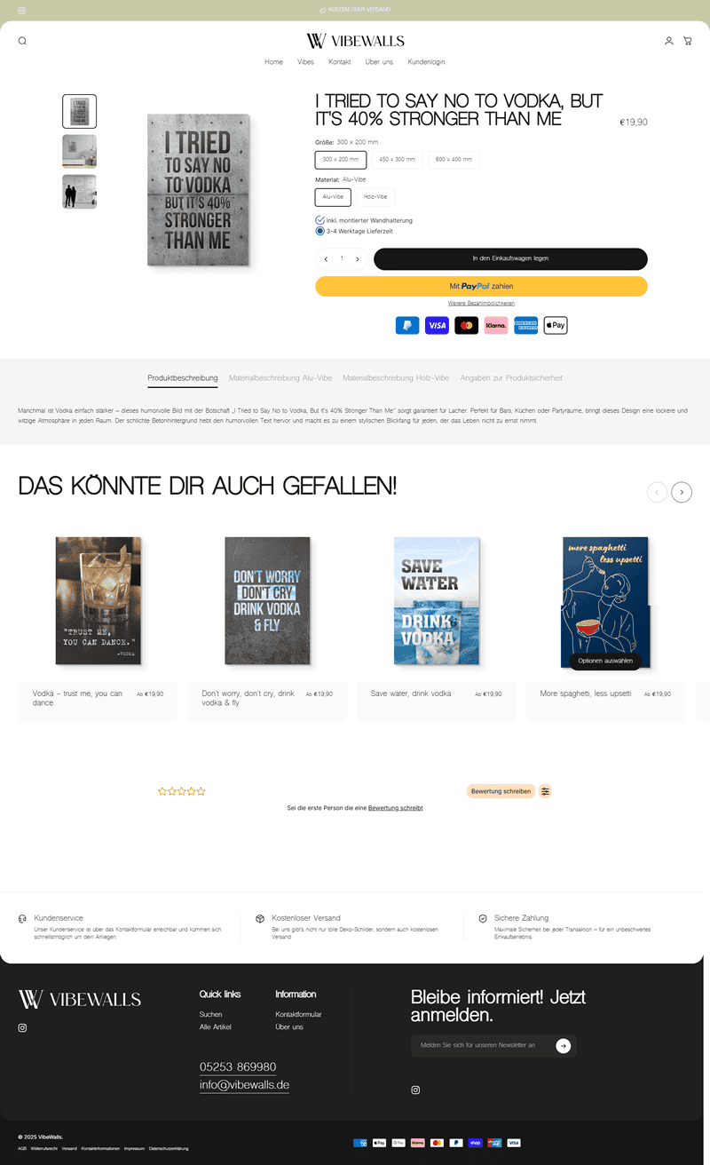 Um Vibewalls.de von der Konkurrenz abzuheben, wurden individuelle Shopify-Template-Anpassungen vorgenommen: